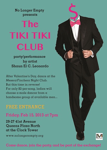 The night after Valentine’s day, Queens based artist Shaun Leonardo will be transforming No Longer Empty’s current exhibition into a Mesera club – but one where roles and expectations are reversed. Unlike typical Central and Latin American Mesera clubs (now very popular in Queens), this club will ask women to pay men for a dance of cumbia, bachata or merengue, putting them in the position of choice and power. Hosted within No Longer Empty’s current exhibition in a vacant bank building, party goers will enjoy a DJ featuring Latin American music, drinks, and dances with professional dancers around the old bank building.