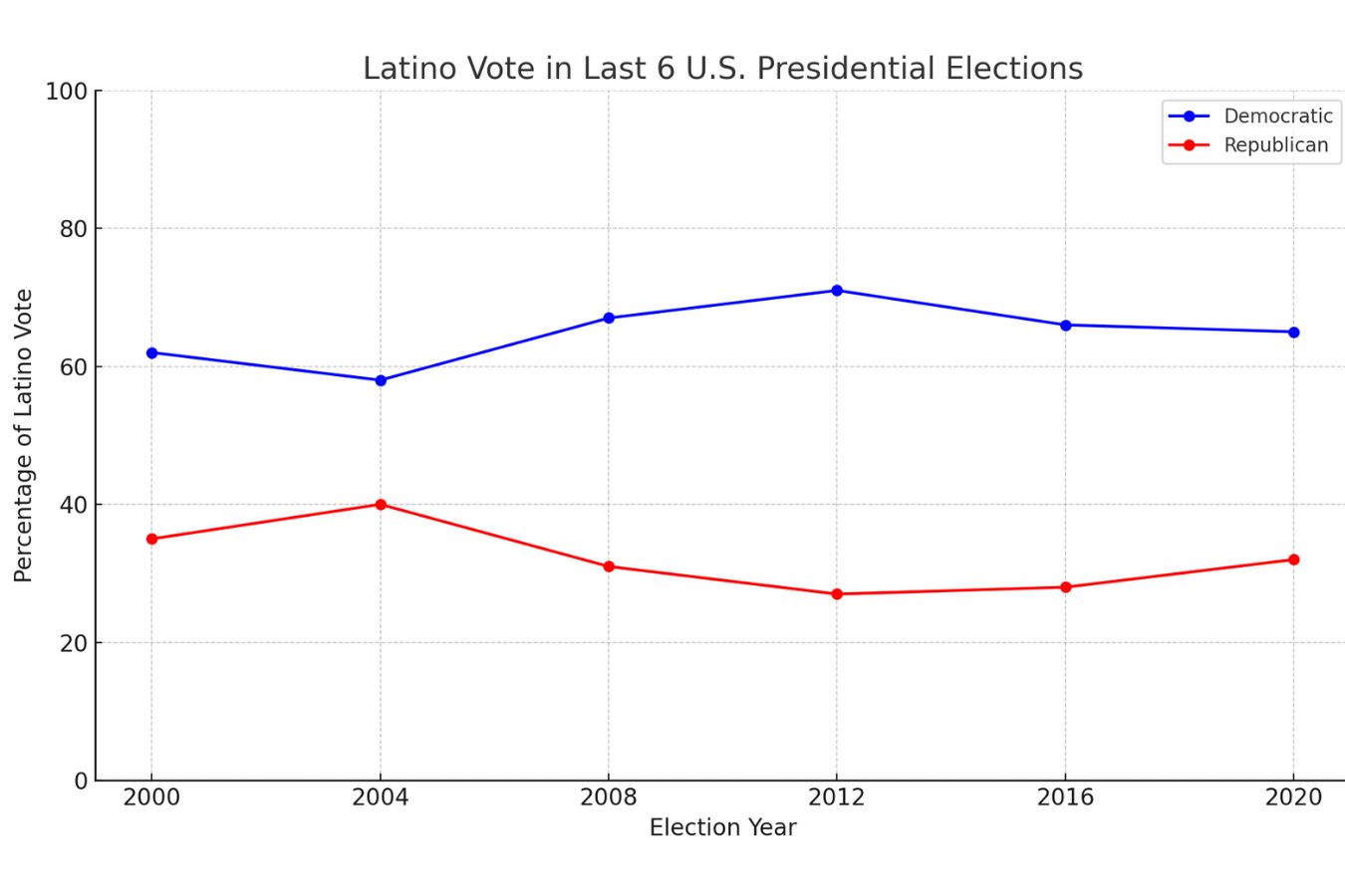 In the 2000 election, Al Gore secured about 62% of the Latino vote, while George W. Bush garnered around 35%, a strong showing for a Republican. Bush improved his standing in 2004, winning approximately 40% of the Latino vote—thanks in part to his outreach and Spanish-language media strategy. However, Democrats saw a surge in 2008 with Barack Obama capturing about 67%, and he expanded that margin in 2012 with 71%, driven by support for immigration reform and healthcare access.
