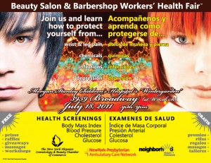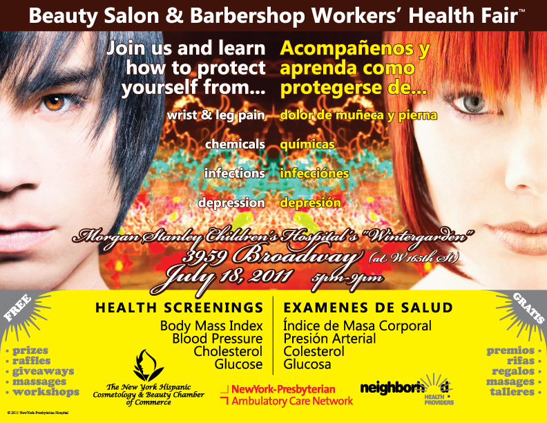 NewYork-Presbyterian Hospital’s Ambulatory Care Network will present a free health fair for cosmetology and beauty care industry professionals. Those attending will learn about health issues, including exposure to chemical products used for hair and skin, injury from repetitive movements and continuous standing as well as the importance of sterilization and disinfection of instruments. The health fair will also offer free blood pressure, cholesterol, glucose and BMI screenings. Health awareness event providing education, workshops and health screening activities to promote personal health and safety issues, as well as professional development.
