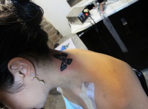 It’s Vanessa Hudgens. Since starring in Disney’s 2005 mega-hit High School Musical as Gabriella Montez, Vanessa Hudgens has grown quite a bit. And as a sign of her maturing she has opted to go under the needle, and get inked. Getting a butterfly at the bottom of her nape, Hudgens got inked last night while in New York City and was accompanied by MTV Australia VJ, Ruby Rose (know for her own collection of body art).