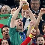 Goalkeeper Iker Casillas, the captain, accepted the trophy from FIFA president Sepp Blatter, kissed it and raised it for all to see while cameras flashed and confetti flew throughout the still-full stadium.