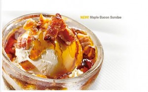 Bacon is back! For a limited time only, Denny’s is hosting what they’re calling the “Baconalia” festival with seven bacon-laden dishes including a Triple Bacon Sampler, a BBBLT Sandwich, and the implausible (but not improbable) Maple Bacon Sundae. It features maple flavored syrup, vanilla ice cream, and “a generous sprinkle of our diced hickory-smoked bacon.”